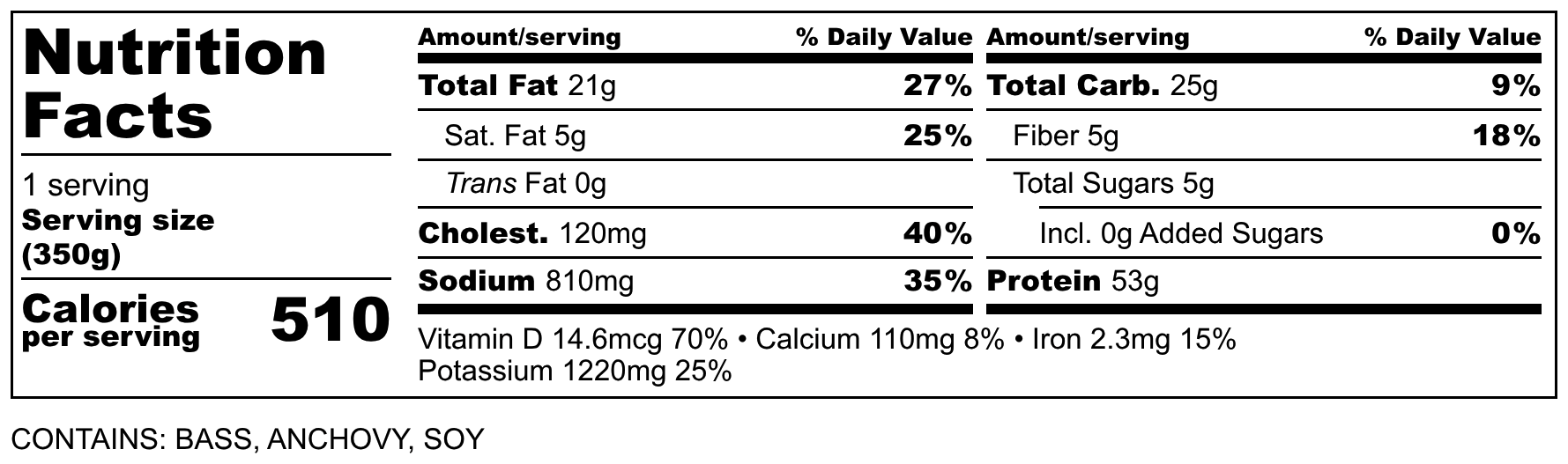 Fish, sea bass, mixed species, cooked, dry heat, Potatoes, mashed (potatoes, milk, butter, salt), Sautéed Green Beans with Garlic (Green Beans, Peppers, Garlic, Canola Oil, Salt), Canola Oil, Soy Sauce (Water, Soybeans, Salt), Fish Sauce (Anchovies, Salt), Garlic Powder, Lemon Juice, Lime Juice, Salt