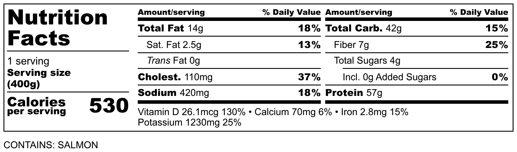 SALMON, COUSCOUS, COOKED, VEGETABLES MIXED, SALSA ROJA (CRUSHED TOMATOE, ONION, TOMATOES, GREEN PEPPERS, ANCHO PEPPER, APPLE CIDER VINEGAR, KASHMIRI CHILI PEPPER, CAYENNE PEPPER, SALT, CUMIN), GARLIC, CANOLA OIL, APPLE CIDER VINEGAR, SALT, BLACK PEPPER