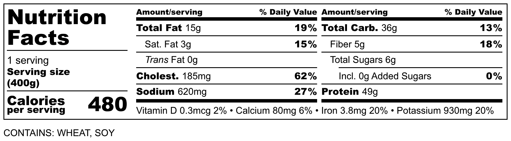 Calories 480kcl Protein 49g Carbs 36g Fat 15g