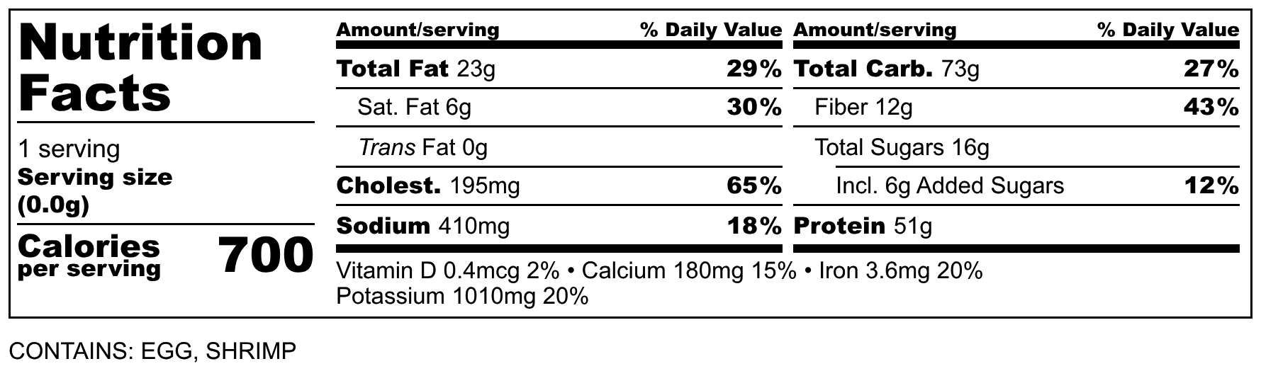 Made in a kitchen that processes eggs, fish, milk, peanuts, sesame, shellfish, soy, tree nuts, and wheat.