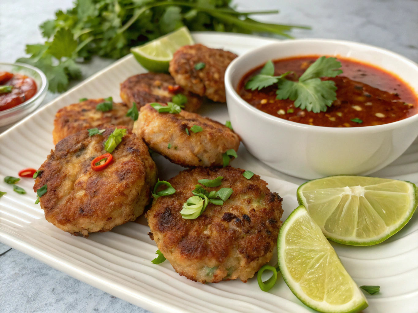 Juicy patties blending ground pork and tender shrimp with Asian aromatics, served with a vibrant sweet-tangy-spicy Thai sauce. A delicious fusion of seafood and meat elevated with fresh herbs and citrus notes.