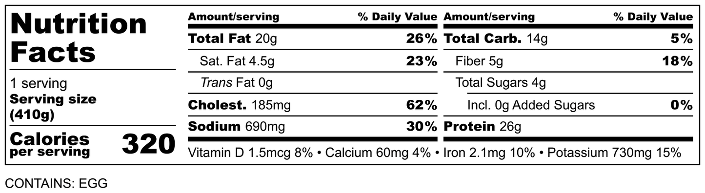Calories 320kcl Protein 26g Carbs 14g Fat 20g