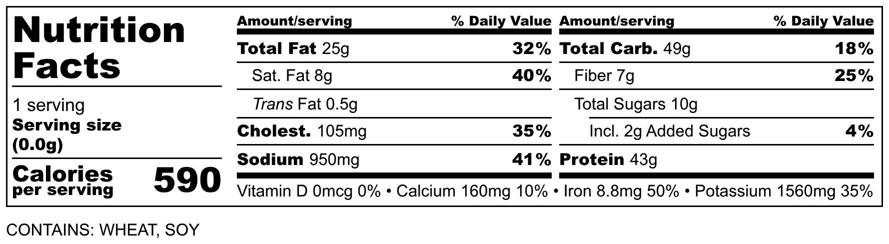 Calories 590kcl Protein 43g Carbs 49g Fat 25g