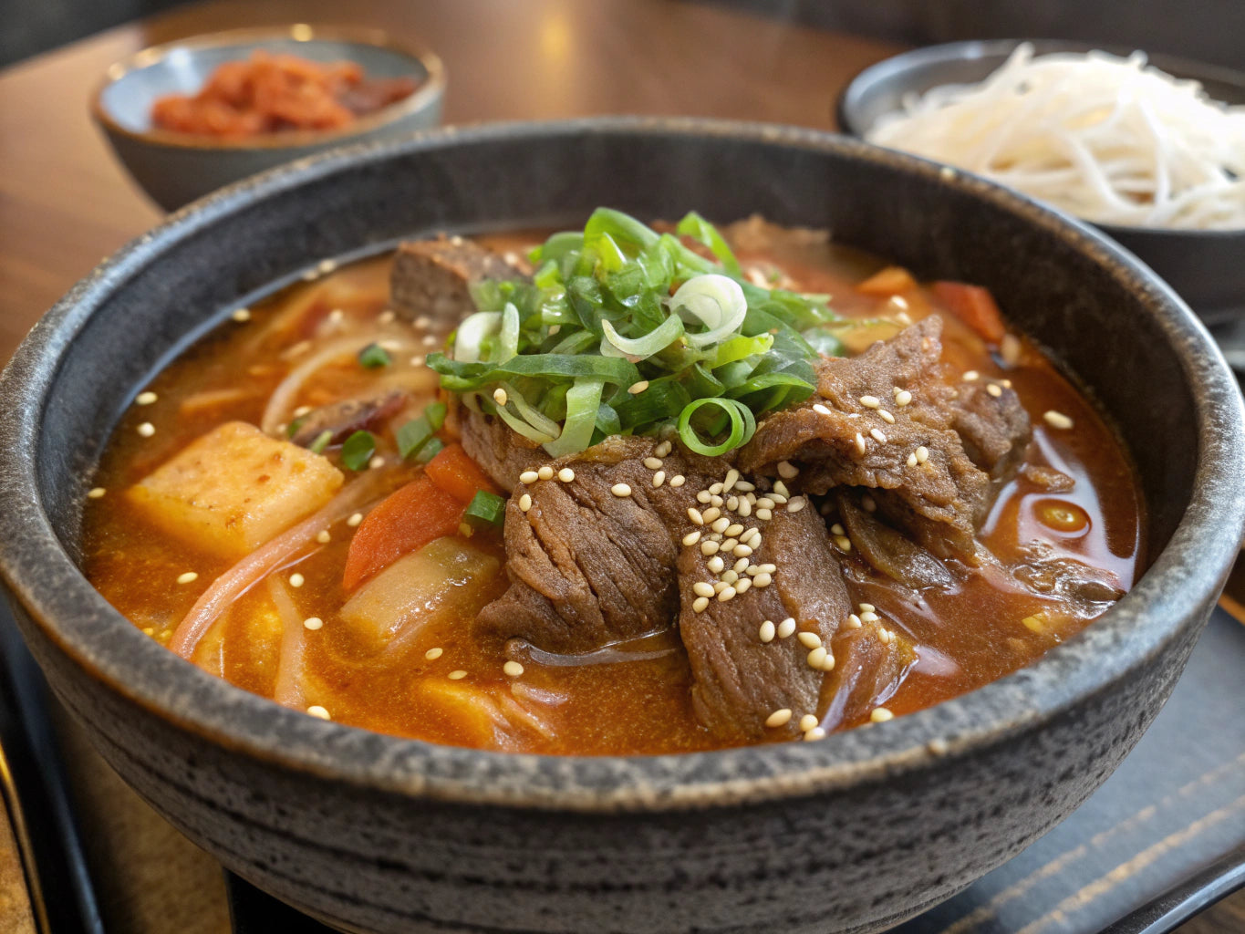 A rich and comforting traditional dish featuring tender chunks of beef slowly simmered in a savory-sweet broth infused with soy sauce, garlic, ginger, and Korean spices. This hearty stew balances complex flavors with nutritious ingredients, served alongside quinoa rice and spinach for a complete, satisfying meal that delivers authentic Korean comfort food with a healthy twist.