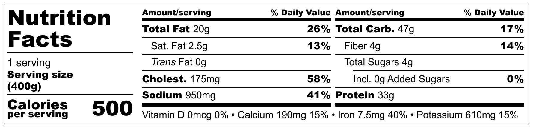 Calories 500kcl Protein 33g Carbs 47g Fat 20g