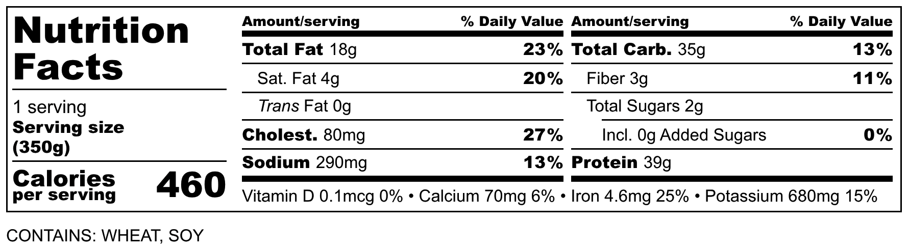 Calories 460kcl Protein 39g Carbs 35g Fat 18g