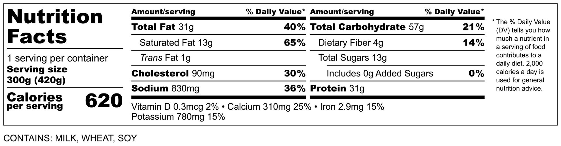 Calories 620kcl Protein 31g Carbs 57g Fat 31g