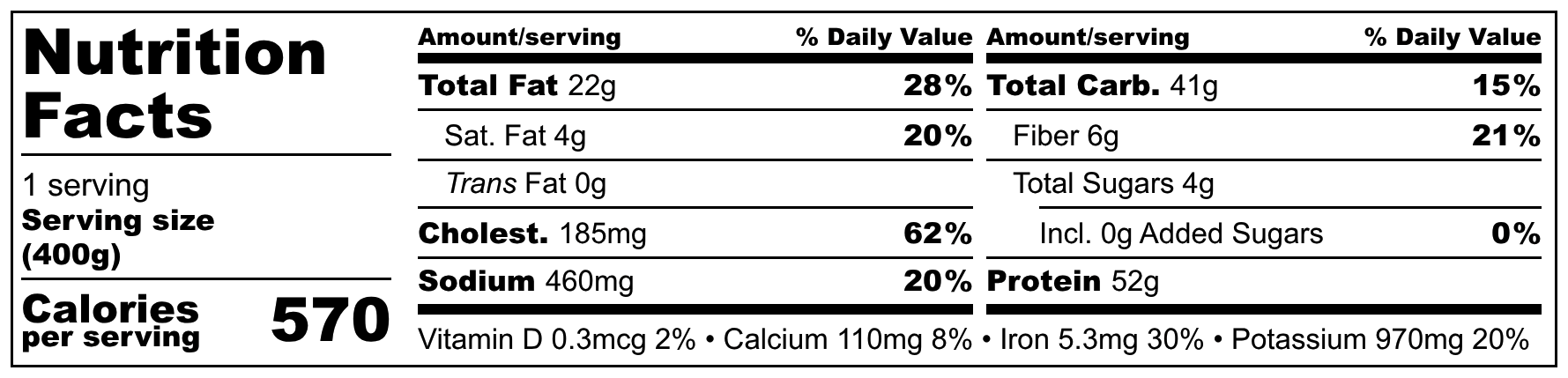 Calories 570kcl Protein 52g Carbs 41g Fat 22g