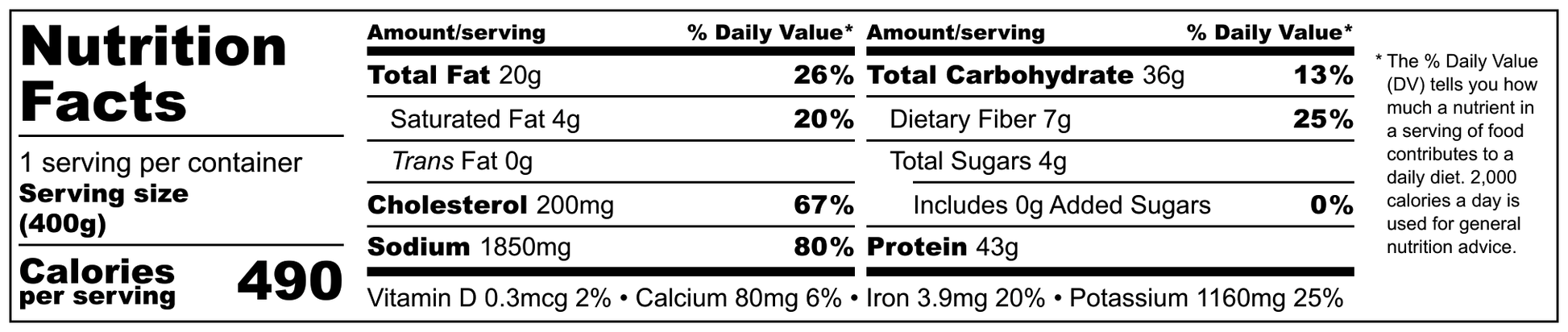 Calories 490kcl Protein 43g Carbs 36g Fat 20g