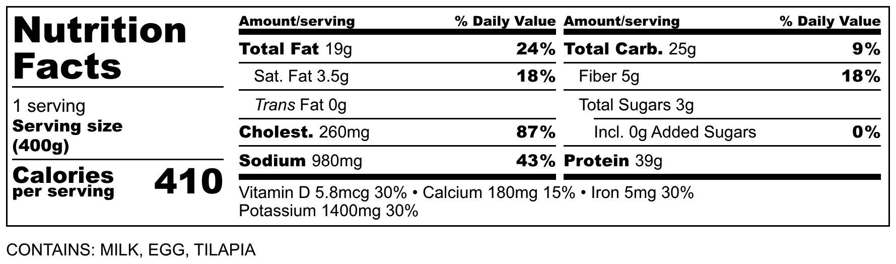 Tilapia, Potatoes, mashed (potatoes, milk, butter, salt), Spinach, Egg Yolk, Mustard (Water, Vinegar, Mustard Seed, Salt, White Wine, Fruit Pectin, Citric Acid, Tartaric Acid, Sugar, Spice), Canola Oil, Lemon Juice, Garlic Powder, Paprika, Salt, Black Pepper