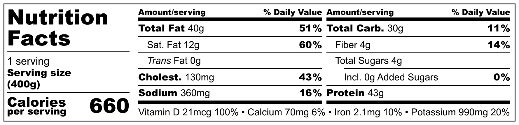 Calories 660kcl Protein 43g Carbs 30g Fat 40g