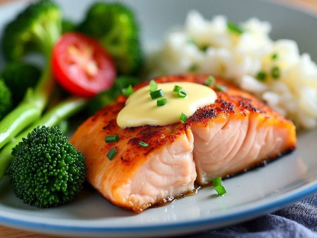 Salmon, Brown Rice, Sautéed Green Beans with Garlic (Green Beans, Peppers, Garlic, Canola Oil, Salt), Butter, Shallots, Garlic, White Wine, Cream, Salt, Black Pepper
