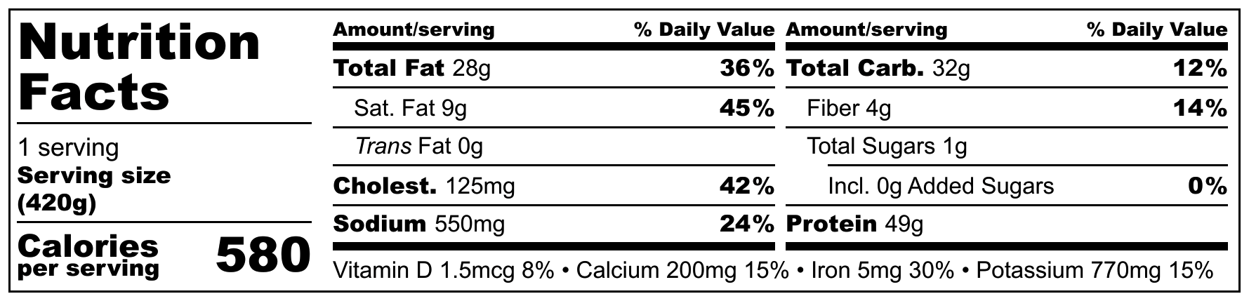 Calories 580kcl Protein 49g Carbs 32g Fat 28g