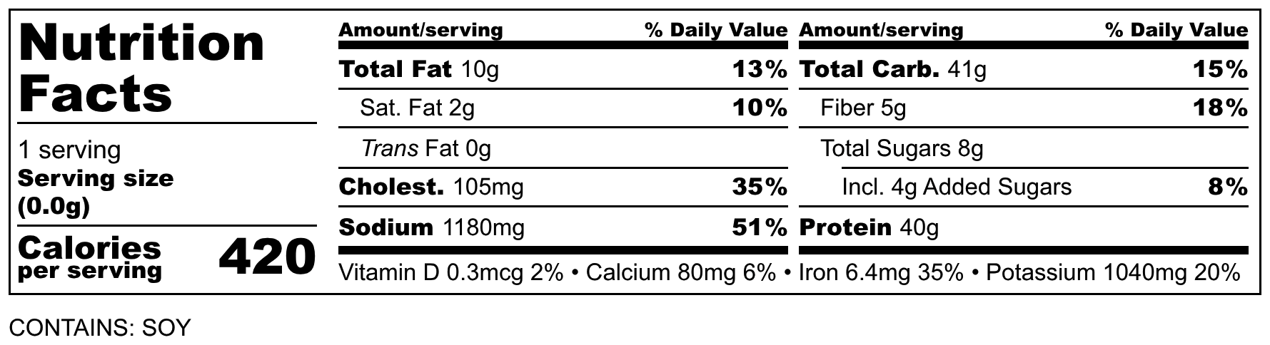 Calories 420kcl Protein 40g Carbs 41g Fat 10g