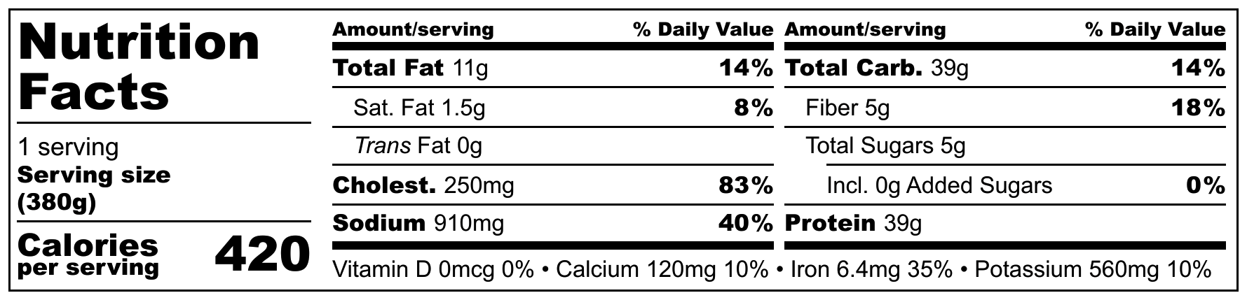 Calories 420kcl Protein 39g Carbs 39g Fat 11g
