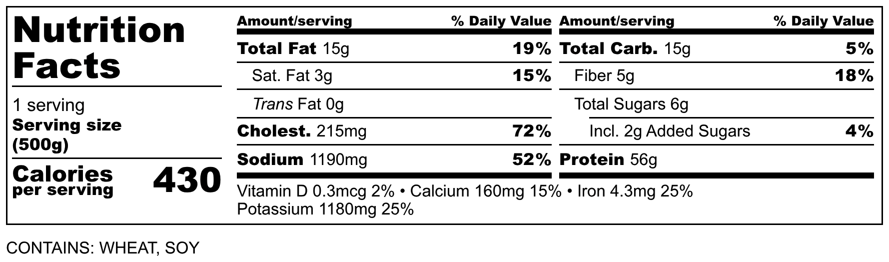 Calories 430kcl Protein 56g Carbs 15g Fat 15g