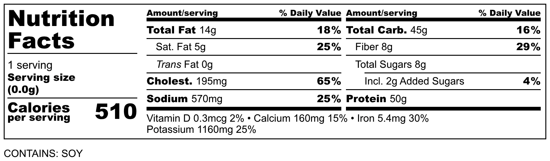 Calories 510kcl Protein 50g Carbs 45g Fat 14g