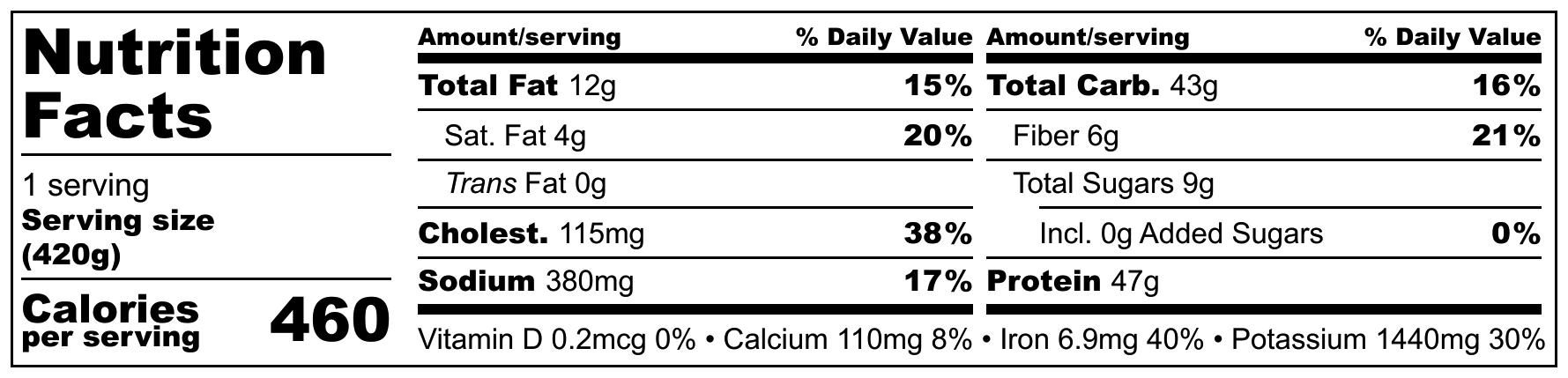 Calories 460kcl Protein 47g Carbs 43g Fat 12g