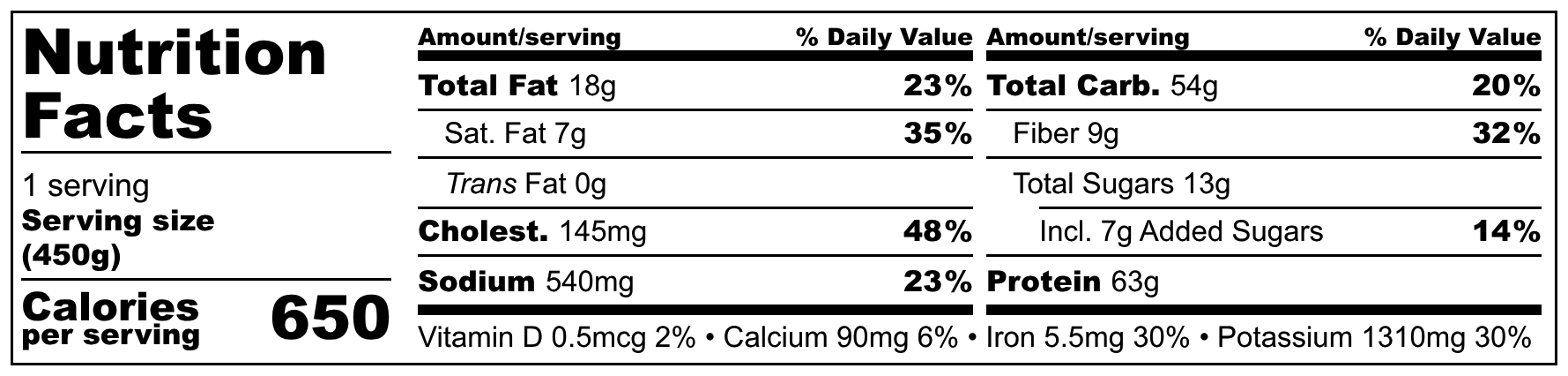 Calories 650kcl Protein 63g Carbs 54g Fat 18g