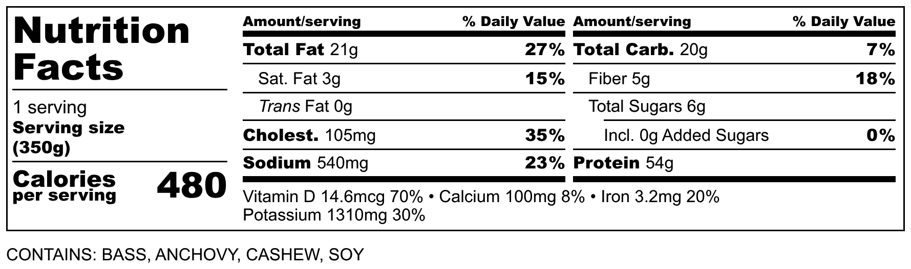 魚,鱸魚,混合品種,煮熟,乾熱,蒜炒青豆(青豆,辣椒,大蒜,菜籽油,鹽),花椰菜,腰果,菜籽油,醬油(水,大豆,鹽),大蒜粉、檸檬汁、萊姆汁、魚露(鯷魚、鹽)