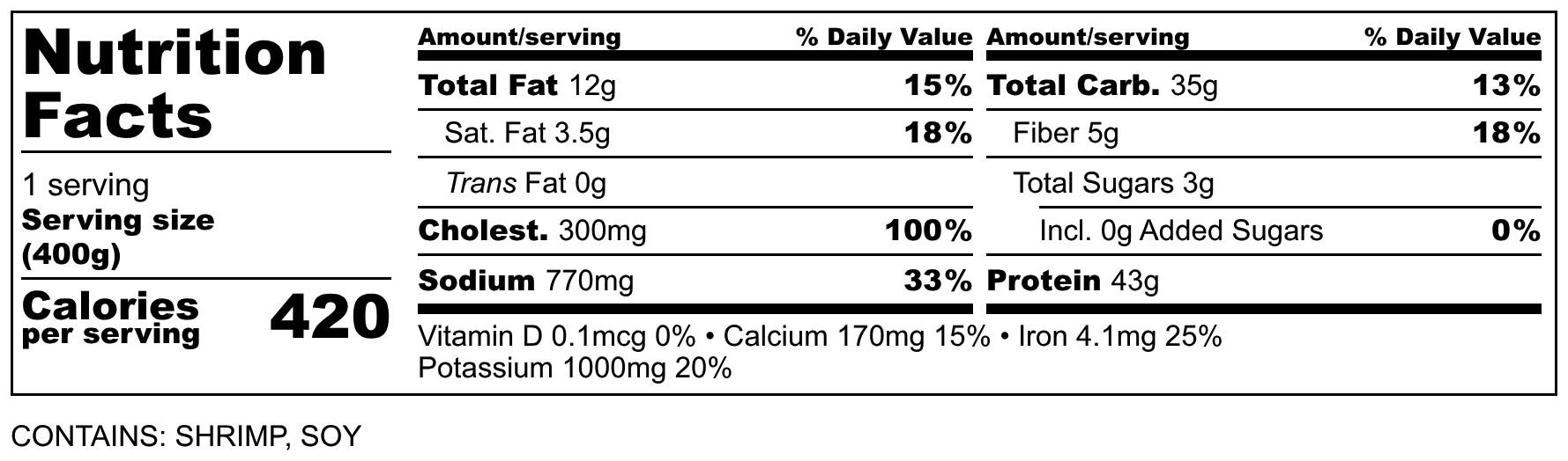 Crustaceans, shrimp, raw (not previously frozen), Quinoa Rice (Quinoa, Rice), Cabbage, kimchi, Broccoli Garlic (Broccoli, Garlic, Canola Oil, Salt), Cauliflower, Carrots, Roasted Mushrooms (Shiitake Mushroom, king trumpet mushroom, Canola Oil, Red Wine Vinegar, Salt, Black Pepper), Soy Sauce (Water, Soybeans, Salt), Butter, Canola Oil, Garlic Powder